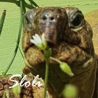 Sloli, russische Landschildkröte, wurde im Alter von rund 15 Jahren im Sommer 1983 in einem Zooladen erworben und frisstete sein Dasein fast ausschließlich im Zimmer in einem Hasenkäfig. Irgendwann im Laufe dieser 37 Jahre erlitt er höchst wahrscheinlich einen Hirnschlag der größtenteils zur Erblindung (auf einem Auge scheint er zumindest noch hell und dunkel sehen zu können) und zu motorischen Einschränkungen führte. Auf Grund der neurologischen Schädigung überstreckt er seine Gliedmaßen in zum Teil sehr befremdlich anmutende Richtungen. Wir haben ihm versprochen, dass er für immer bleiben darf. Solange man ihn nicht hochhebt (er verliert sofort die Orientierung), kommt er in seinem Gehege wunderbar zurecht und ist ein dankbarer Sonnenanbeter geworden.