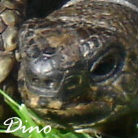 Dino, ebenfalls eine russische Landschildkröte, zog im Jahr 2008 auf die Schildkrötenburg. Auf Grund falscher Haltung ist sein Panzer völlig deformiert, sein Schnabel war so weich und verzogen dass er nicht selbständig Nahrung aufnehmen konnte. Er war zu schwach zum Laufen und saß mehr tot als lebendig im Gehege und wenn er sich bewegte, schleppte er sich mühsam herum. Auf Grund der Fehlstellung seiner Vorderbeinchen scheuerte er sich seinen Hals wund. Eigentlich sind wir nicht davon ausgegangen, dass er es schaffen würde und wurden eines Besseren belehrt. Sechs Jahre haben wir seine Wiesenkräuter in sehr kleine Stückchen geschnitten und waren Dauergast beim Tierarzt. Seit 2014 lebt er mit vier Damen im Gehege. Sein Panzer ist feste, er hat an Gewicht zugelegt, bewegt sich flott und frisst zwischenzeitlich ohne Probleme alles was im Gehege wächst.