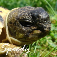 Speedy ist eine russische Landschildkröte, die 2006 bei uns einzog, nachdem die ehemaligen Halter kein Interesse mehr an dem kleinen Mann hatten. Er ist bereits sehr alt und hat einiges in seinem Leben hinter sich, was man an diversen (inzwischen verheilten) Verletzungen sehen konnte. Speedy wird, da er nur 300 Gramm wiegt und entsprechend seinen Artgenossen nichts entgegenzuhalten hat, bei uns bleiben.